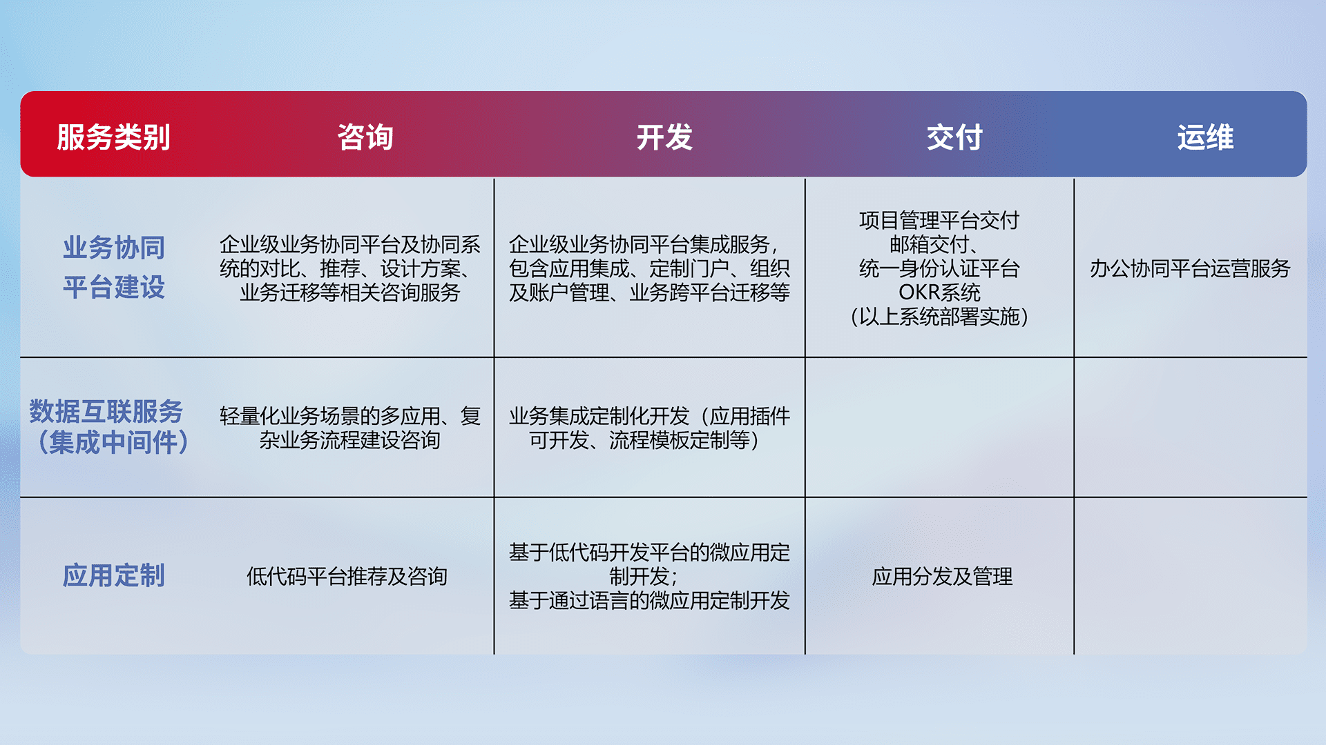 针对钉钉、、、、企微、、IDaas等平台级产品提供产品的规划、、方案、、交付、、定制化开发等服务,,实现如统一协同办公、、、智能客户服务、、、、混合会议管理、、智能数据查询、、、等业务场景,,,实现数字化转型。。。。